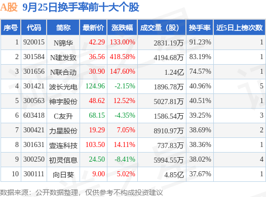 当日A股换手率前10大个股中7只个股收涨,平均涨幅105.41%,其中N锦华(920015)以换手率91.23%排第一,4只个股近5个交易日中多次上榜。