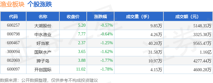 证券之星消息,9月25日渔业板块较上一交易日下跌1.3%,开创国际领跌。当日上证指数报收于3853.3,下跌0.01%。深证成指报收于13445.9,上涨0.67%。渔业板块个股涨跌见下表: