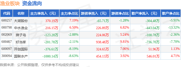 从资金流向上来看,当日渔业板块主力资金净流出1115.47万元,游资资金净流入2102.5万元,散户资金净流出987.03万元。渔业板块个股资金流向见下表: