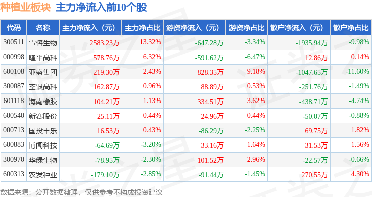 从资金流向上来看,当日种植业板块主力资金净流出1.1亿元,游资资金净流入6717.41万元,散户资金净流入4317.85万元。种植业板块个股资金流向见下表: