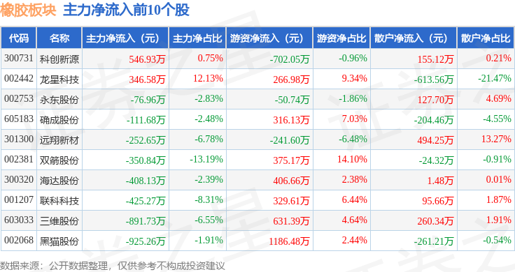 从资金流向上来看,当日橡胶板块主力资金净流出2.48亿元,游资资金净流入9066.42万元,散户资金净流入1.57亿元。橡胶板块个股资金流向见下表:
