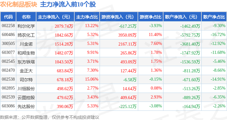 从资金流向上来看,当日农化制品板块主力资金净流出3.65亿元,游资资金净流入2.36亿元,散户资金净流入1.29亿元。农化制品板块个股资金流向见下表: