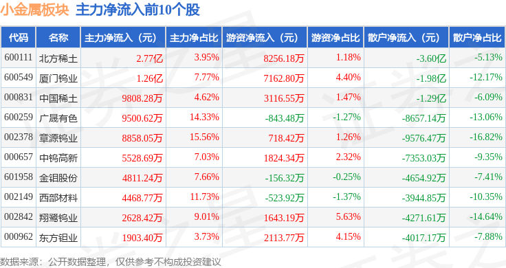 从资金流向上来看,当日小金属板块主力资金净流入4.79亿元,游资资金净流入3.44亿元,散户资金净流出8.23亿元。小金属板块个股资金流向见下表: