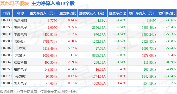 从资金流向上来看,当日其他电子板块主力资金净流出2.94亿元,游资资金净流出3.95亿元,散户资金净流入6.89亿元。其他电子板块个股资金流向见下表: