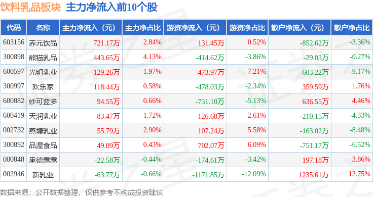 从资金流向上来看,当日饮料乳品板块主力资金净流出3.43亿元,游资资金净流入5929.61万元,散户资金净流入2.84亿元。饮料乳品板块个股资金流向见下表: