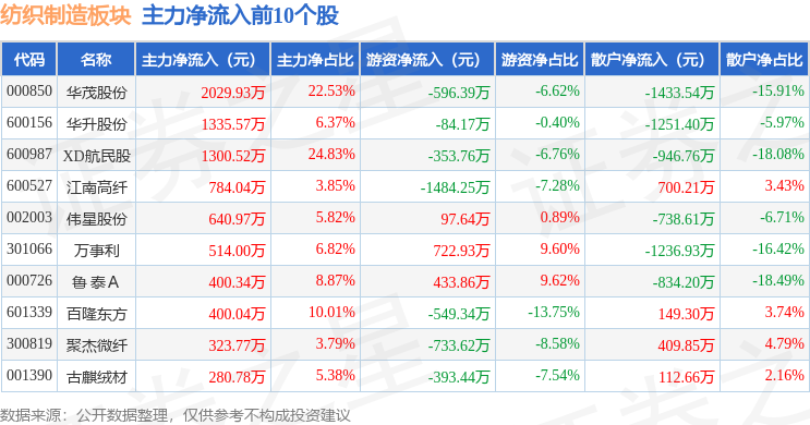 从资金流向上来看,当日纺织制造板块主力资金净流出1.08亿元,游资资金净流入745.16万元,散户资金净流入1.0亿元。纺织制造板块个股资金流向见下表: