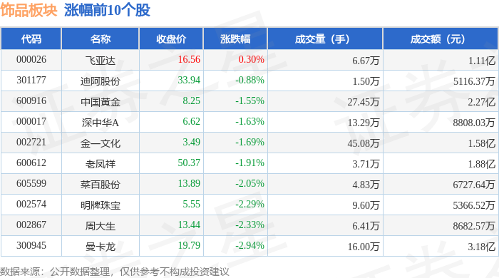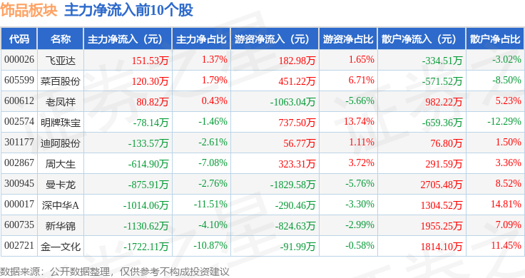 从资金流向上来看,当日饰品板块主力资金净流出2.38亿元,游资资金净流入1654.01万元,散户资金净流入2.21亿元。饰品板块个股资金流向见下表: