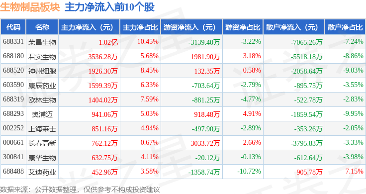 从资金流向上来看,当日生物制品板块主力资金净流出2.07亿元,游资资金净流入1.62亿元,散户资金净流入4507.15万元。生物制品板块个股资金流向见下表: