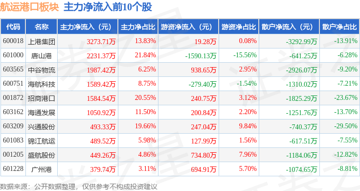从资金流向上来看,当日航运港口板块主力资金净流出4.62亿元,游资资金净流入2.02亿元,散户资金净流入2.6亿元。航运港口板块个股资金流向见下表: