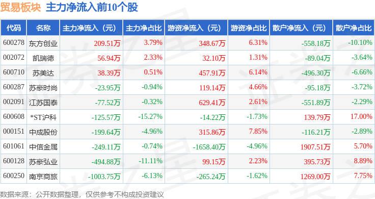 从资金流向上来看,当日贸易板块主力资金净流出1.32亿元,游资资金净流入3291.61万元,散户资金净流入9920.33万元。贸易板块个股资金流向见下表:
