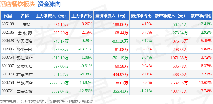 从资金流向上来看,当日酒店餐饮板块主力资金净流出7964.83万元,游资资金净流出1076.11万元,散户资金净流入9040.95万元。酒店餐饮板块个股资金流向见下表: