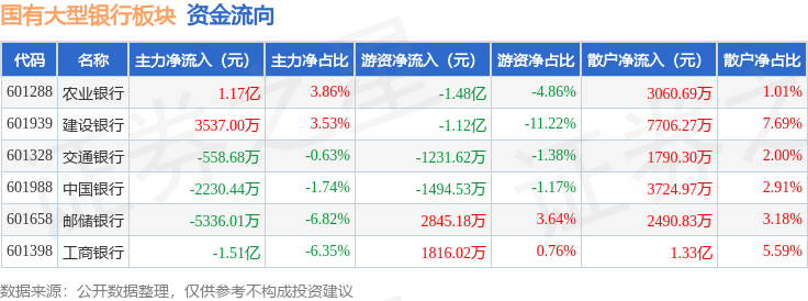 从资金流向上来看,当日国有大型银行板块主力资金净流出7979.31万元,游资资金净流出2.41亿元,散户资金净流入3.21亿元。国有大型银行板块个股资金流向见下表: