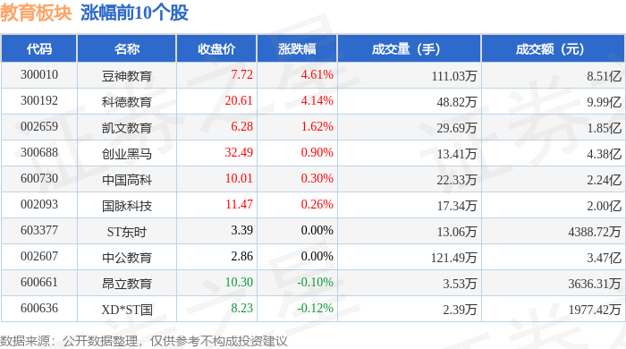 证券之星消息,9月25日教育板块较上一交易日上涨0.91%,豆神教育领涨。当日上证指数报收于3853.3,下跌0.01%。深证成指报收于13445.9,上涨0.67%。教育板块个股涨跌见下表:
