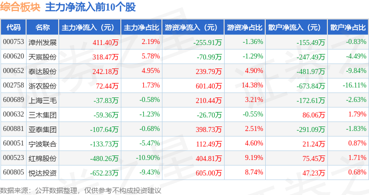 从资金流向上来看,当日综合板块主力资金净流出2.37亿元,游资资金净流入9936.0万元,散户资金净流入1.38亿元。综合板块个股资金流向见下表: