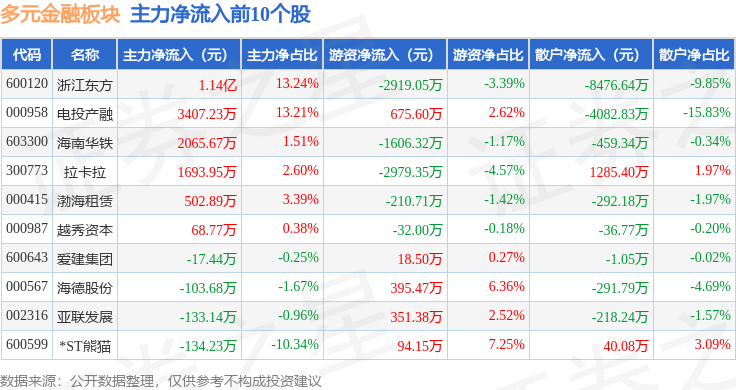 从资金流向上来看,当日多元金融板块主力资金净流出1.87亿元,游资资金净流出74.58万元,散户资金净流入1.87亿元。多元金融板块个股资金流向见下表: