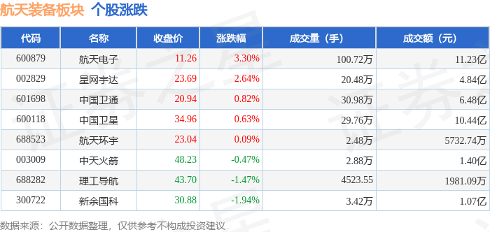 证券之星消息,9月25日航天装备板块较上一交易日上涨1.05%,航天电子领涨。当日上证指数报收于3853.3,下跌0.01%。深证成指报收于13445.9,上涨0.67%。航天装备板块个股涨跌见下表: