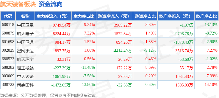 从资金流向上来看,当日航天装备板块主力资金净流入1.71亿元,游资资金净流入2211.02万元,散户资金净流出1.93亿元。航天装备板块个股资金流向见下表: