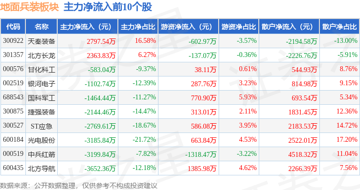 从资金流向上来看,当日地面兵装板块主力资金净流出5.36亿元,游资资金净流入819.91万元,散户资金净流入5.28亿元。地面兵装板块个股资金流向见下表: