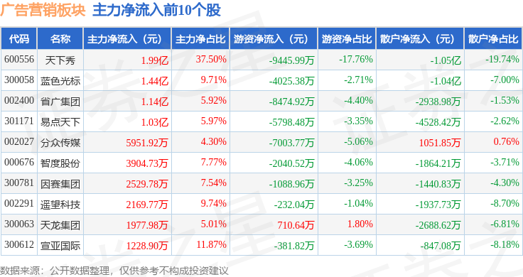 从资金流向上来看,当日广告营销板块主力资金净流入6.81亿元,游资资金净流出3.77亿元,散户资金净流出3.04亿元。广告营销板块个股资金流向见下表: