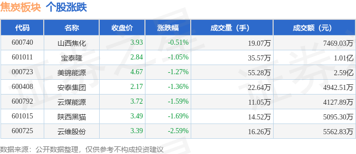 证券之星消息,9月25日焦炭板块较上一交易日下跌1.29%,云维股份领跌。当日上证指数报收于3853.3,下跌0.01%。深证成指报收于13445.9,上涨0.67%。焦炭板块个股涨跌见下表: