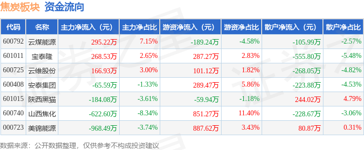 从资金流向上来看,当日焦炭板块主力资金净流出1110.07万元,游资资金净流入2167.58万元,散户资金净流出1057.51万元。焦炭板块个股资金流向见下表: