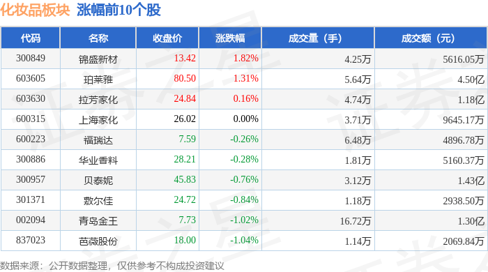 证券之星消息,9月25日化妆品板块较上一交易日下跌0.34%,嘉亨家化领跌。当日上证指数报收于3853.3,下跌0.01%。深证成指报收于13445.9,上涨0.67%。化妆品板块个股涨跌见下表: