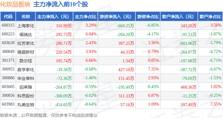 从资金流向上来看,当日化妆品板块主力资金净流出4989.87万元,游资资金净流入2052.13万元,散户资金净流入2937.73万元。化妆品板块个股资金流向见下表: