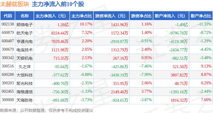 从资金流向上来看,当日太赫兹板块主力资金净流出4.39亿元,游资资金净流出1.99亿元,散户资金净流入6.38亿元。太赫兹板块个股资金流向见下表: