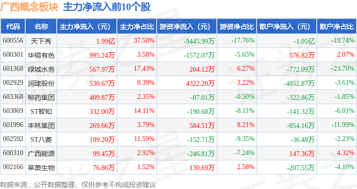 从资金流向上来看,当日广西概念板块主力资金净流出7290.43万元,游资资金净流入7736.15万元,散户资金净流出445.71万元。广西概念板块个股资金流向见下表: