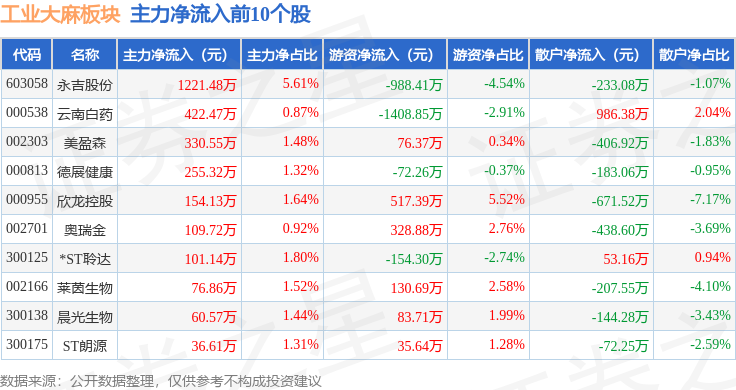 从资金流向上来看,当日工业大麻板块主力资金净流出2.65亿元,游资资金净流入7213.94万元,散户资金净流入1.93亿元。工业大麻板块个股资金流向见下表:
