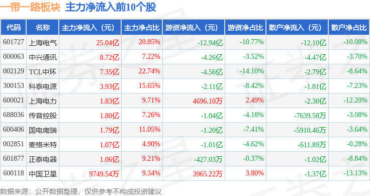 从资金流向上来看,当日一带一路板块主力资金净流出17.87亿元,游资资金净流出11.11亿元,散户资金净流入28.98亿元。一带一路板块个股资金流向见下表: