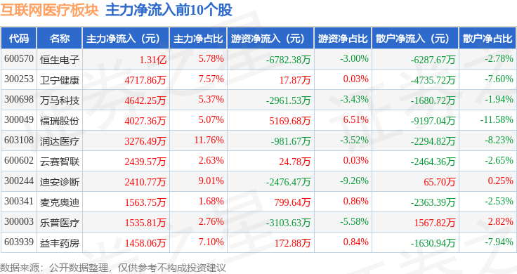 从资金流向上来看,当日互联网医疗板块主力资金净流出7.73亿元,游资资金净流入2.52亿元,散户资金净流入5.21亿元。互联网医疗板块个股资金流向见下表: