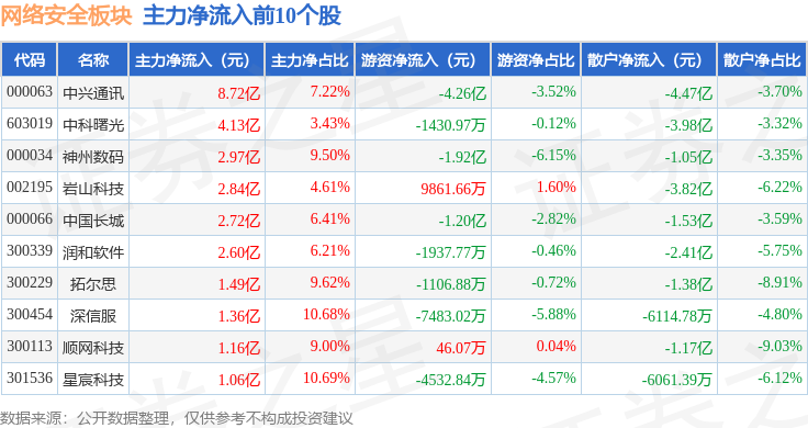 从资金流向上来看,当日网络安全板块主力资金净流入13.49亿元,游资资金净流出4.08亿元,散户资金净流出9.41亿元。网络安全板块个股资金流向见下表: