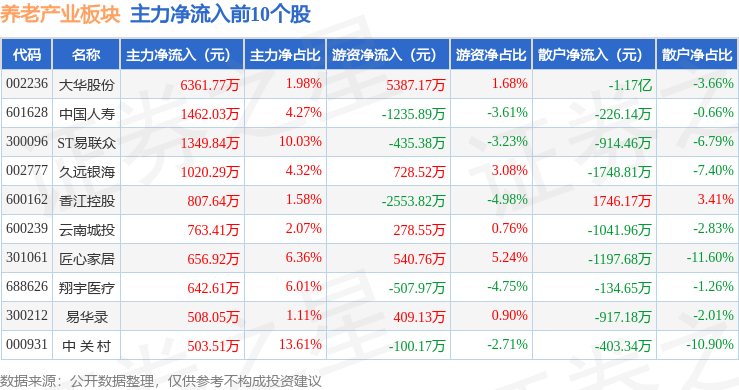 从资金流向上来看,当日养老产业板块主力资金净流出11.03亿元,游资资金净流入4.19亿元,散户资金净流入6.84亿元。养老产业板块个股资金流向见下表:
