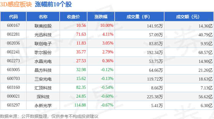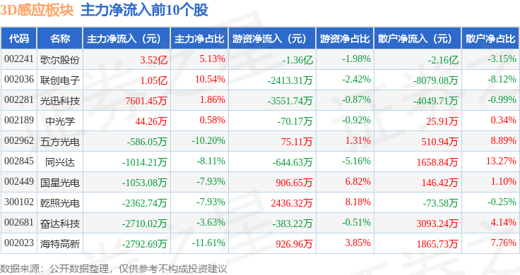 从资金流向上来看,当日3D感应板块主力资金净流出10.64亿元,游资资金净流入2.55亿元,散户资金净流入8.09亿元。3D感应板块个股资金流向见下表: