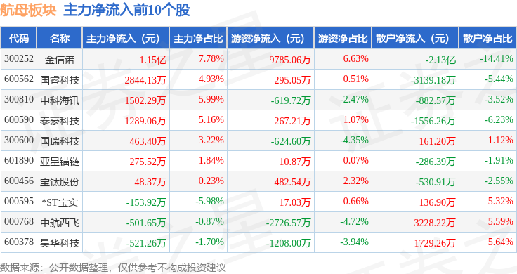 从资金流向上来看,当日航母板块主力资金净流出10.47亿元,游资资金净流入2.14亿元,散户资金净流入8.33亿元。航母板块个股资金流向见下表: