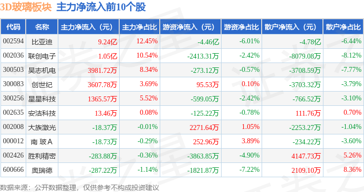 从资金流向上来看,当日3D玻璃板块主力资金净流入4.93亿元,游资资金净流出4.48亿元,散户资金净流出4524.4万元。3D玻璃板块个股资金流向见下表: