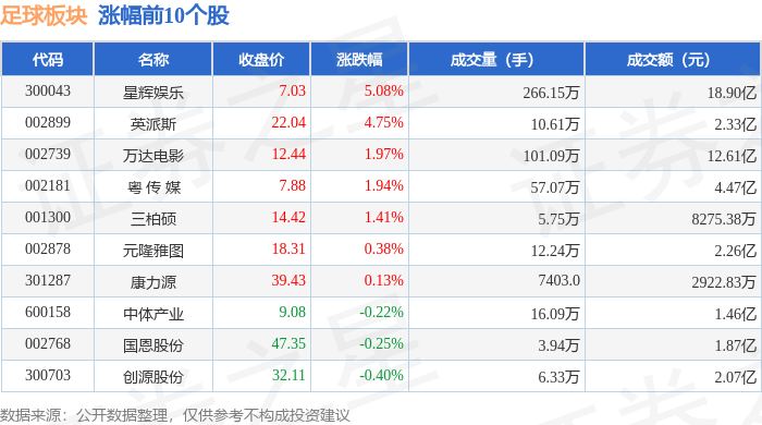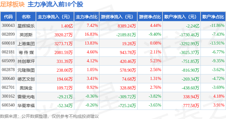 从资金流向上来看,当日足球板块主力资金净流出3.67亿元,游资资金净流入1.12亿元,散户资金净流入2.55亿元。足球板块个股资金流向见下表: