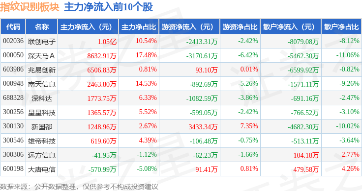 从资金流向上来看,当日指纹识别板块主力资金净流出8.84亿元,游资资金净流出4043.28万元,散户资金净流入9.24亿元。指纹识别板块个股资金流向见下表: