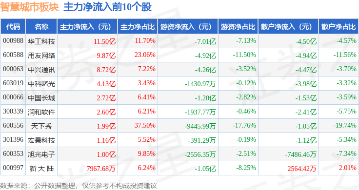从资金流向上来看,当日智慧城市板块主力资金净流出6.84亿元,游资资金净流出6.67亿元,散户资金净流入13.5亿元。智慧城市板块个股资金流向见下表: