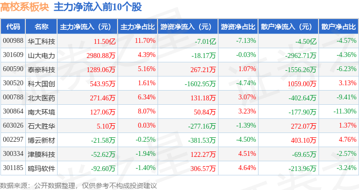 从资金流向上来看,当日高校系板块主力资金净流入8.67亿元,游资资金净流出6.17亿元,散户资金净流出2.5亿元。高校系板块个股资金流向见下表: