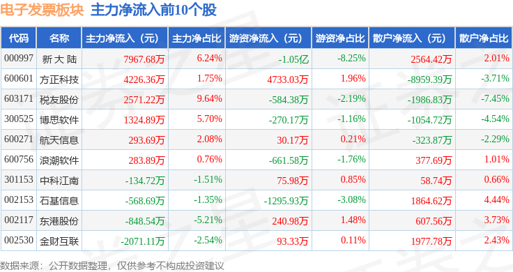 从资金流向上来看,当日电子发票板块主力资金净流出2.23亿元,游资资金净流出1510.75万元,散户资金净流入2.38亿元。电子发票板块个股资金流向见下表: