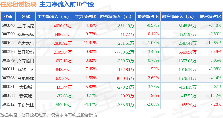 从资金流向上来看,当日住房租赁板块主力资金净流出11.76亿元,游资资金净流入5.52亿元,散户资金净流入6.24亿元。住房租赁板块个股资金流向见下表: