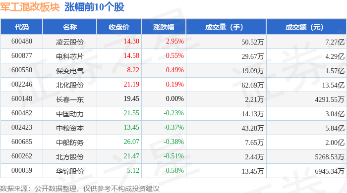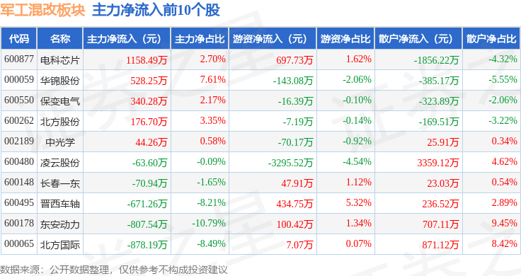 从资金流向上来看,当日军工混改板块主力资金净流出8.36亿元,游资资金净流出2580.17万元,散户资金净流入8.62亿元。军工混改板块个股资金流向见下表: