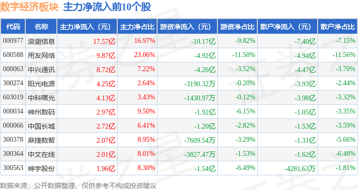 从资金流向上来看,当日数字经济板块主力资金净流入35.48亿元,游资资金净流出23.96亿元,散户资金净流出11.52亿元。数字经济板块个股资金流向见下表: