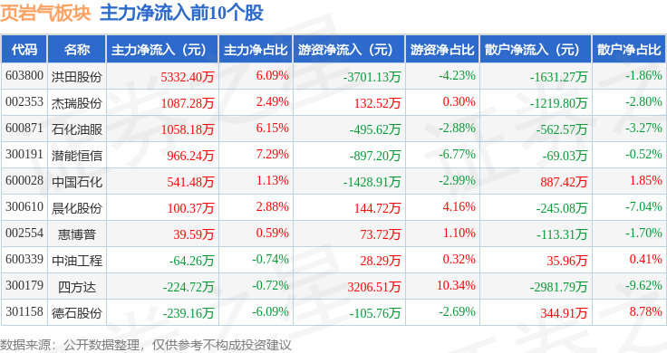 从资金流向上来看,当日页岩气板块主力资金净流出3.44亿元,游资资金净流入1.02亿元,散户资金净流入2.42亿元。页岩气板块个股资金流向见下表: