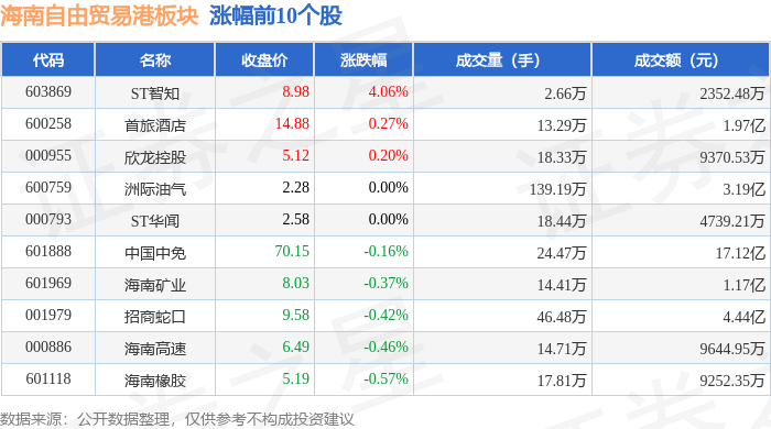 从资金流向上来看,当日海南自由贸易港板块主力资金净流出4.72亿元,游资资金净流入1.35亿元,散户资金净流入3.37亿元。海南自由贸易港板块个股资金流向见下表: