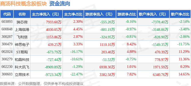 从资金流向上来看,当日商汤科技概念股板块主力资金净流出6477.7万元,游资资金净流入9821.51万元,散户资金净流出3343.81万元。商汤科技概念股板块个股资金流向见下表: