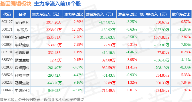 从资金流向上来看,当日基因编辑板块主力资金净流出373.31万元,游资资金净流出9552.39万元,散户资金净流入9925.7万元。基因编辑板块个股资金流向见下表: