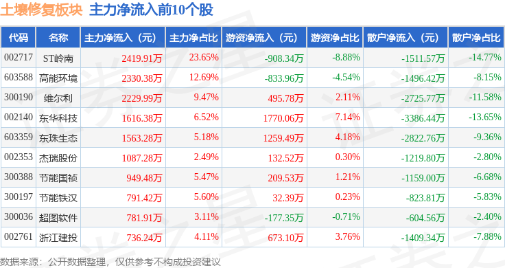 从资金流向上来看,当日土壤修复板块主力资金净流出5.65亿元,游资资金净流入2.9亿元,散户资金净流入2.75亿元。土壤修复板块个股资金流向见下表: